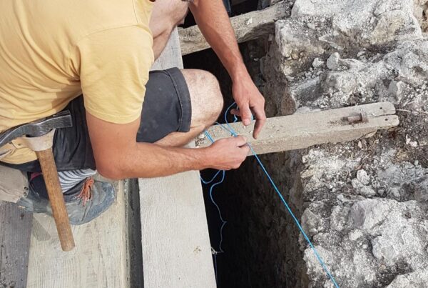 On trace au cordeau... Nettoyage des arases et état des lieux des murs... ça ondule ! Mais l'équipe du chais garde le moral... et burine pour placer les premières solives…