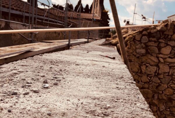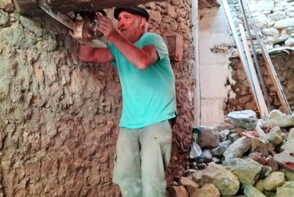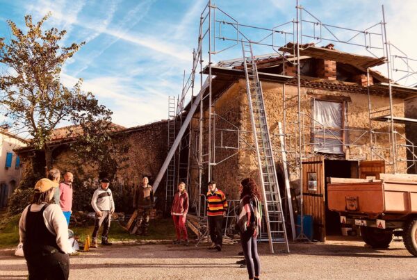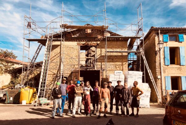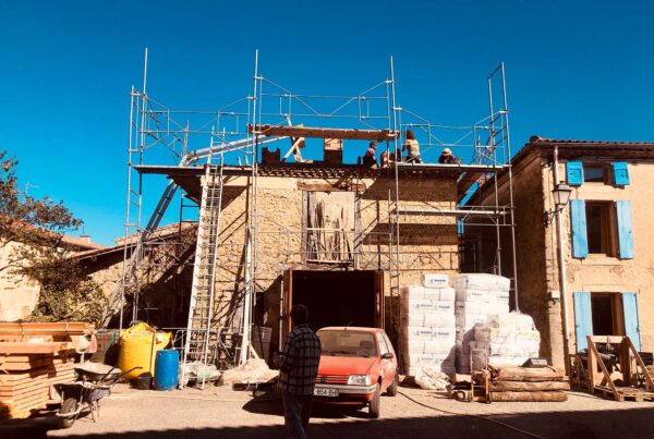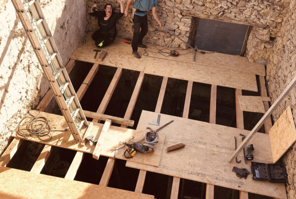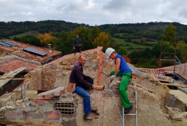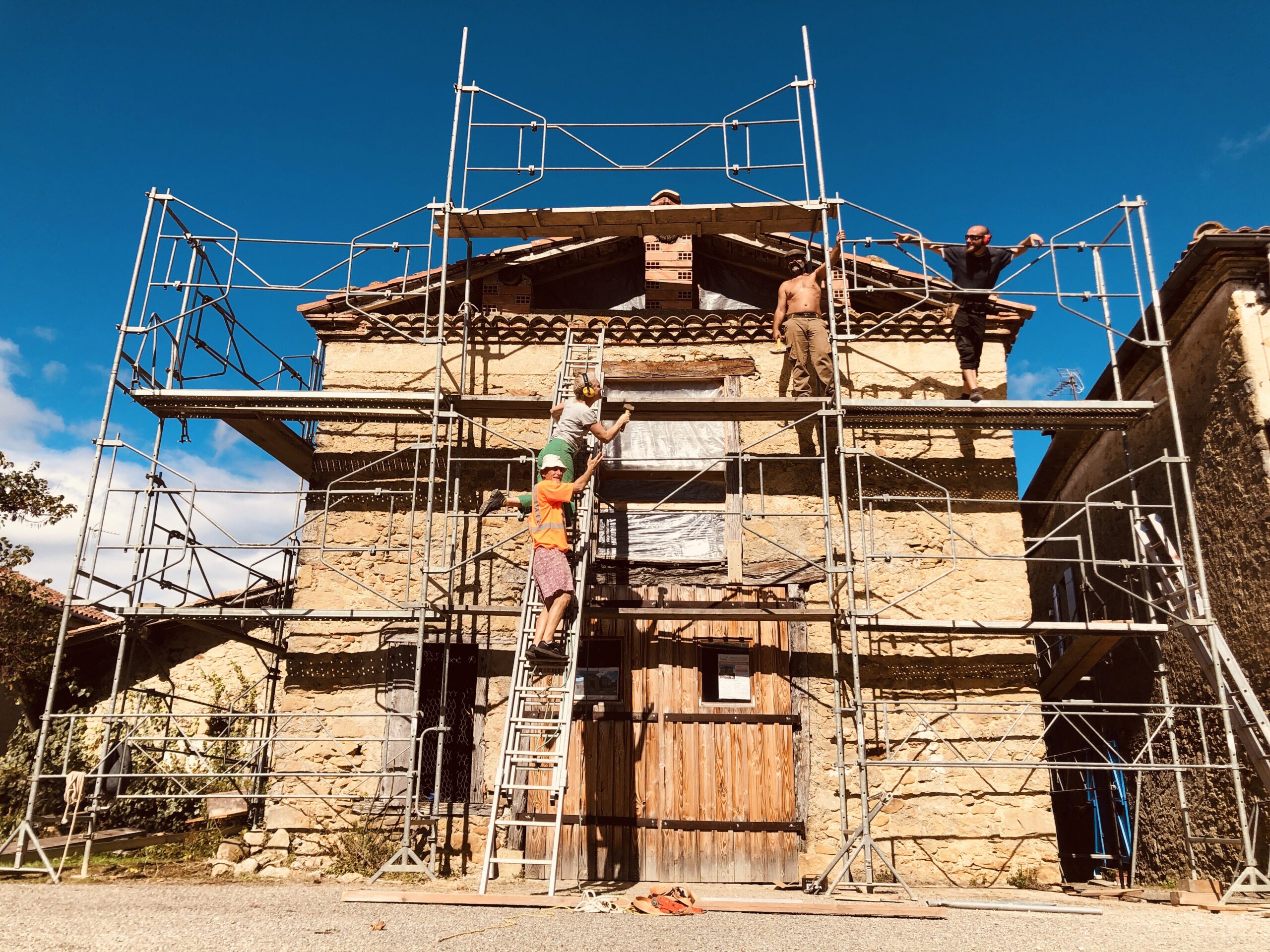 Des solives pour le chais ! Un coup de balai sur les arases ! Repérage des futures pannes, pose des solives du chais. ça burine, ça tape, ça chante et…