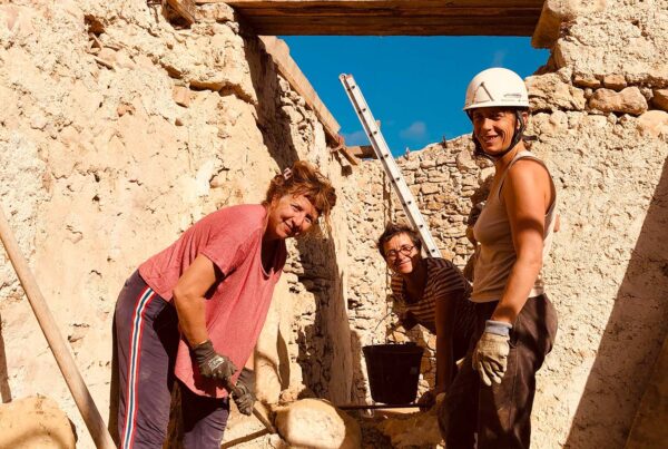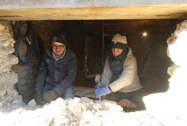 On arase ! Maçonnerie en hauteur. On perce, on creuse, on balaie... les ouvertures des portes intérieures se précisent. Des allers-retours pour débarrasser les gravats.