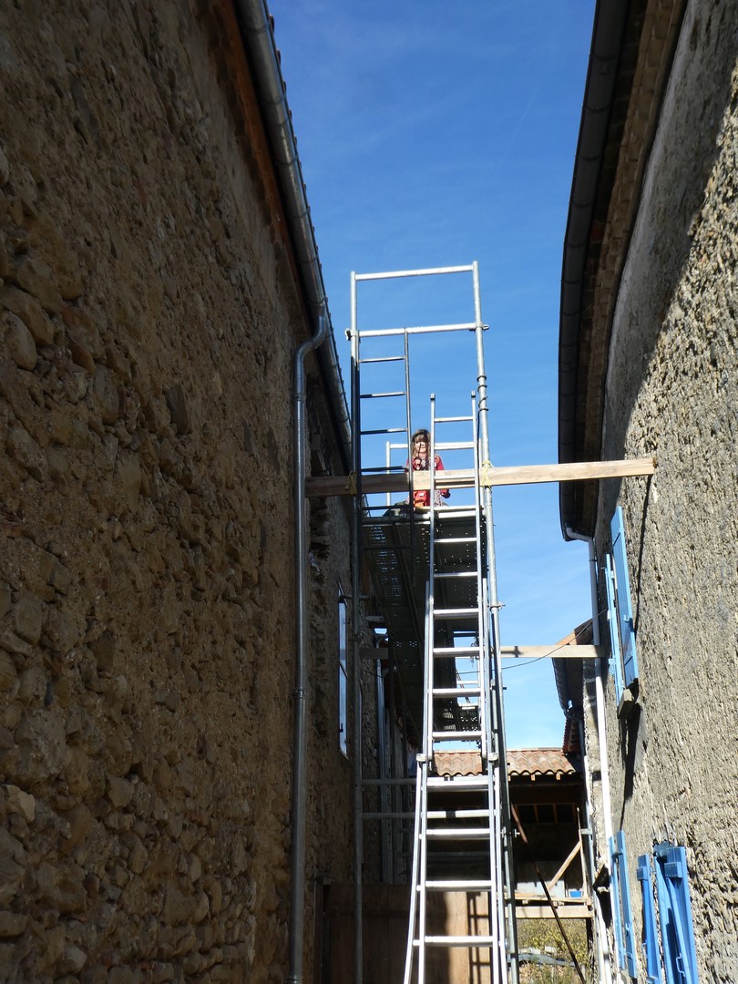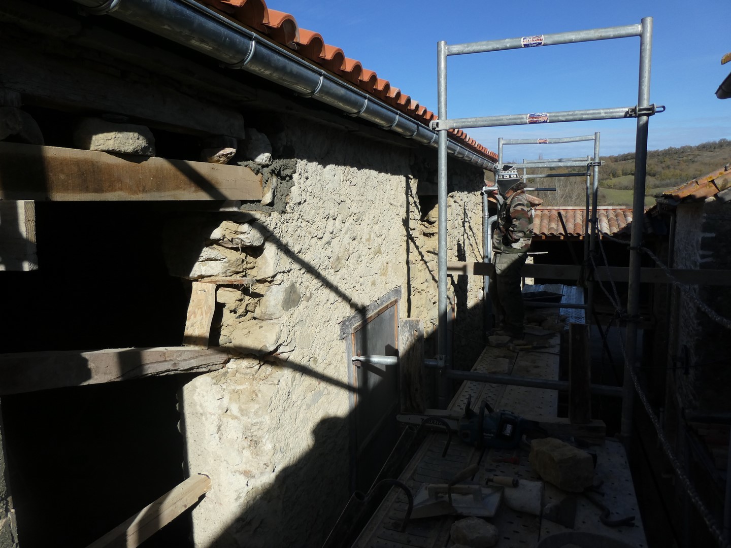 Et puis commence tout ce qui ne se voit pas vraiment…. le calfeutrement des murs de refend, la dépose des pierres pour ouvrir les petites fenêtres de la ruelle… Bref. ça n’a pas chômé, et le tout avec les sourires qui font avancer plus vite !!