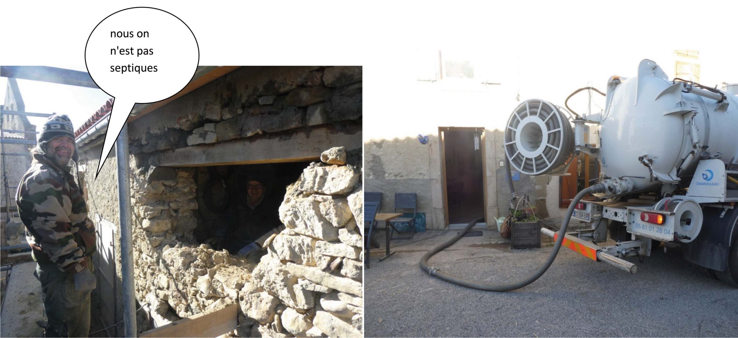 Car, nous, on n’est pas s(c)eptiques… ça va le faire ! (Pendant que la fosse, septique,  elle, de la maison bleue se vidait…, l’équipe de redoutables maçons, reprenait les linteaux de la ruelle.)